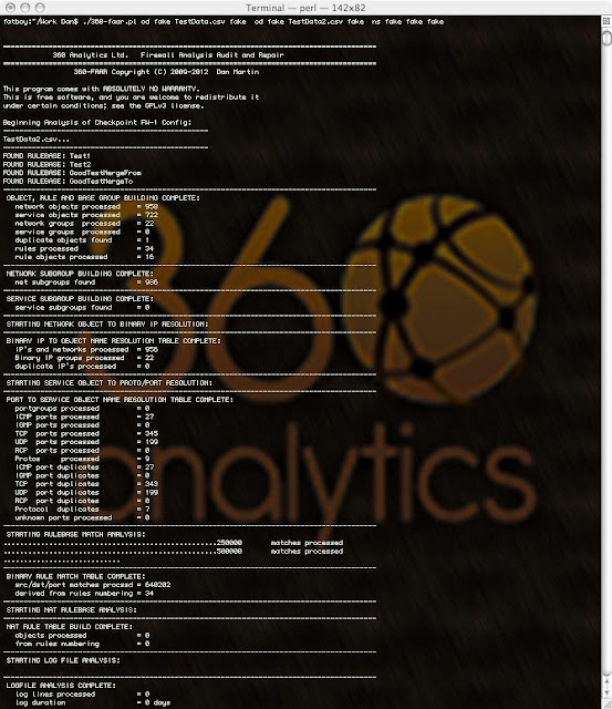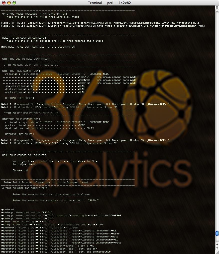 360-FAAR (Firewall Analysis Audit and Repair) is an offline, command line, Perl firewall policy manipulation tool to filter, compare to logs, merge, translate and output firewall commands for new policies, in Checkpoint dbedit, Cisco ASA or ScreenOS commands, and its one file!