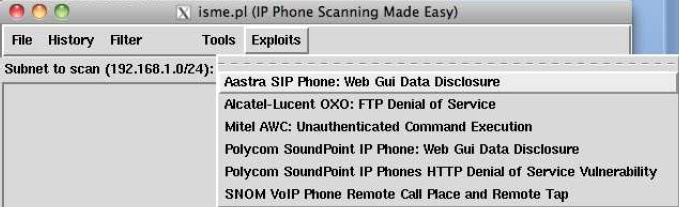 ISME is a small framework to test IP phones from several editors. It can gather information from IP phone infrastructures, test their web servers for default login/password combinations, and also implement attacks against the systems. ISME has been written in perl with a perl/Tk interface to provide a portable and easy to use tool. Full documentation is also provided.