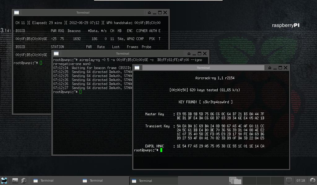 PwnPi is a Linux-based penetration testing dropbox distribution for the Raspberry Pi. It currently has 114 network security tools pre-installed to aid the penetration tester. It is built on the debian squeeze image from the raspberry pi foundation’s website and uses Xfce as the window manager