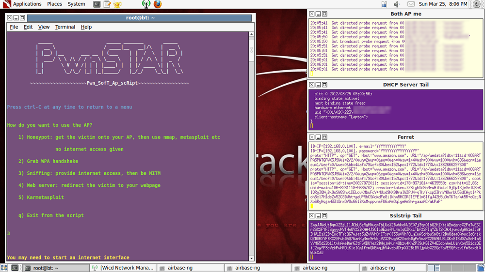 A bash script to launch a Soft AP, configurable with a wide variety of attack options. Includes a number of index.html and server php scripts, for sniffing/phishing. Can act as multi-client captive portal using php and iptables. Launches classic exploits such as evil-PDF. De-auth with aireplay, airdrop-ng or MDK3.
