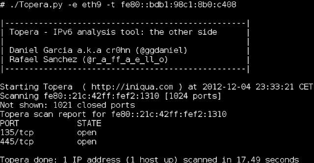 Topera is a brand new TCP port scanner under IPv6, with the particularity that these scans are not detected by Snort.