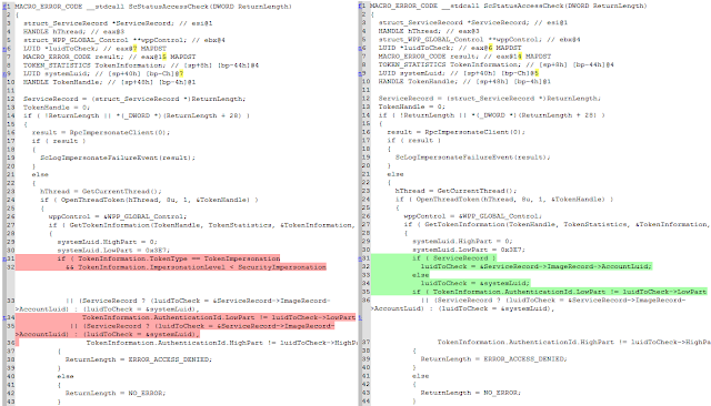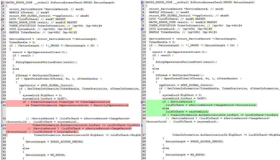 These are some screenshots of Diaphora diffing the Microsoft bulletin MS15-050, extracted from the blog post Analyzing MS15-050 With Diaphora from Alex Ionescu.