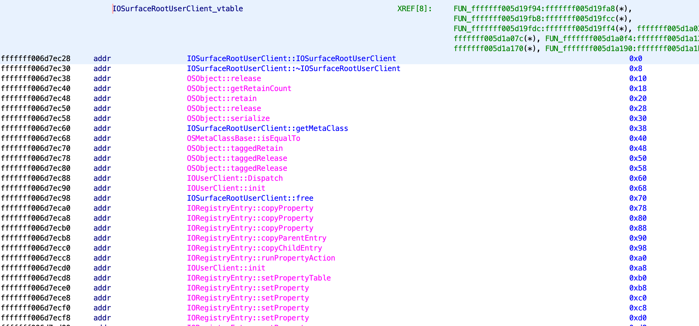 kc.process_class("IOGraphicsAccelerator2")If you run the script against the whole kernelcache, it may take several minutes to finish, once finished, Ghidra will provide the following :